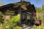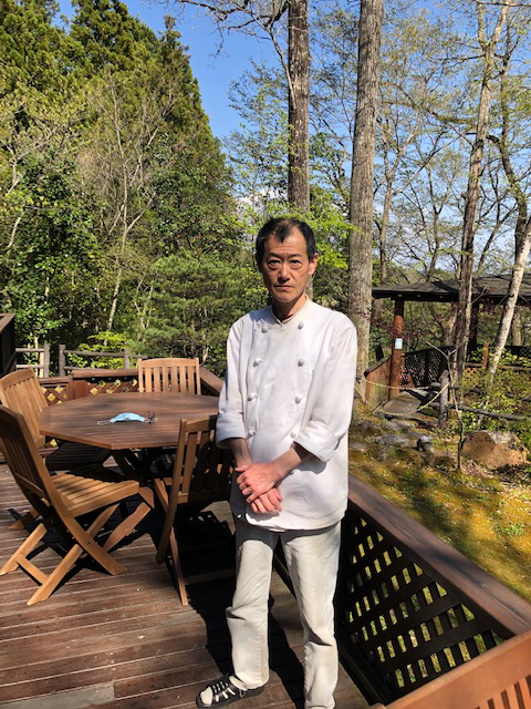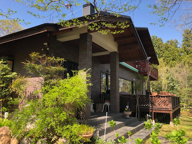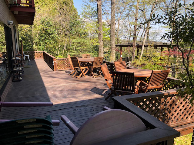 南側の大きなガラス窓の外には広いウッドデッキ・チェアー、少し離れたところには景色を眺望できる東屋もある。来店したのは4 月初め、曇って小雨が降っていたせいで、決して絶景とは言えなかったが、晴れた日には素晴らしい光景が広がっていることだろう。