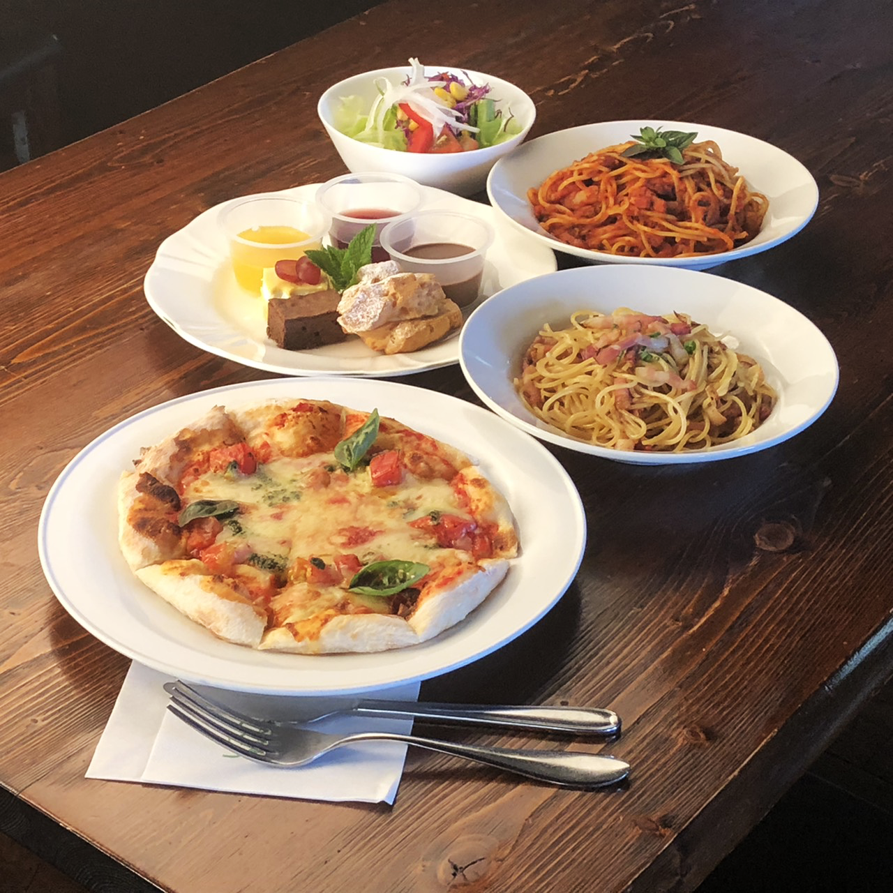 メニューは様々なパスタやピザが主流。特筆すべきはセットメニューも豊富で目移りしてしまうほど。