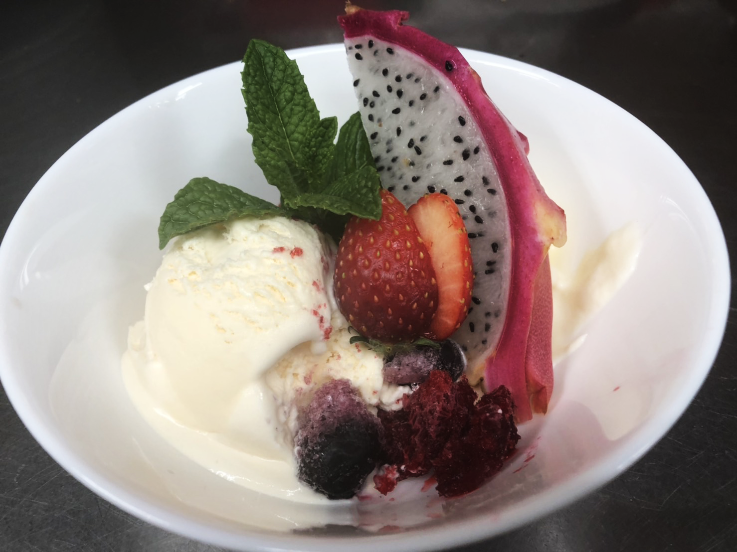 どうしようか・・と思ったのは一瞬で、目を見張るほど「素晴らしい」の一言。食べたこともないカラフルなドラゴンフルーツ、バニラとストロベリー2種類のアイス、イチゴの果肉入りジャムも盛り付けられている。