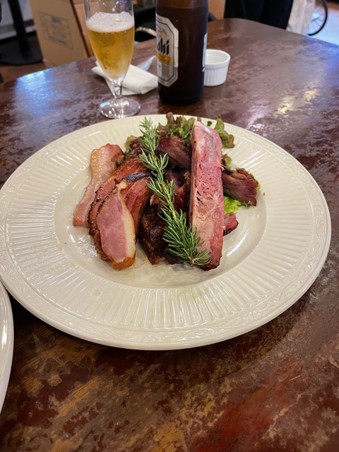 コース的になんでも食べられるとあって、ランダムに矢継ぎ早に注文。間もなくすると新鮮野菜がふんだんに盛り付けられ、その上に生ハムが被さったサラダの大皿とスペアリブ・ベーコン・スモーク肉等が乗った大皿が運ばれてきた。