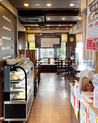 中に入ると、向かって中央にレジ台と厨房からの出入り口がその裏側に備えてある。それを境に比較的広いスペースの左側コーナーと、細長いスペースの右側コーナーに雰囲気のある木製テーブルが整然と並べられている。