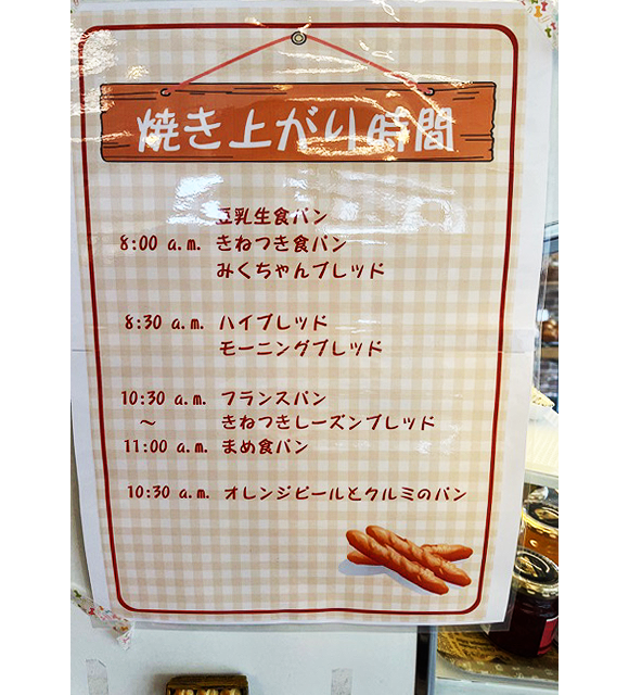 その他、パンの種類により焼き上がり時間が見やすい大きさで伝言板のようになっており、好みのパンの出来立て時間がわかるようになっているのもお客様への心配りだと感じました。
